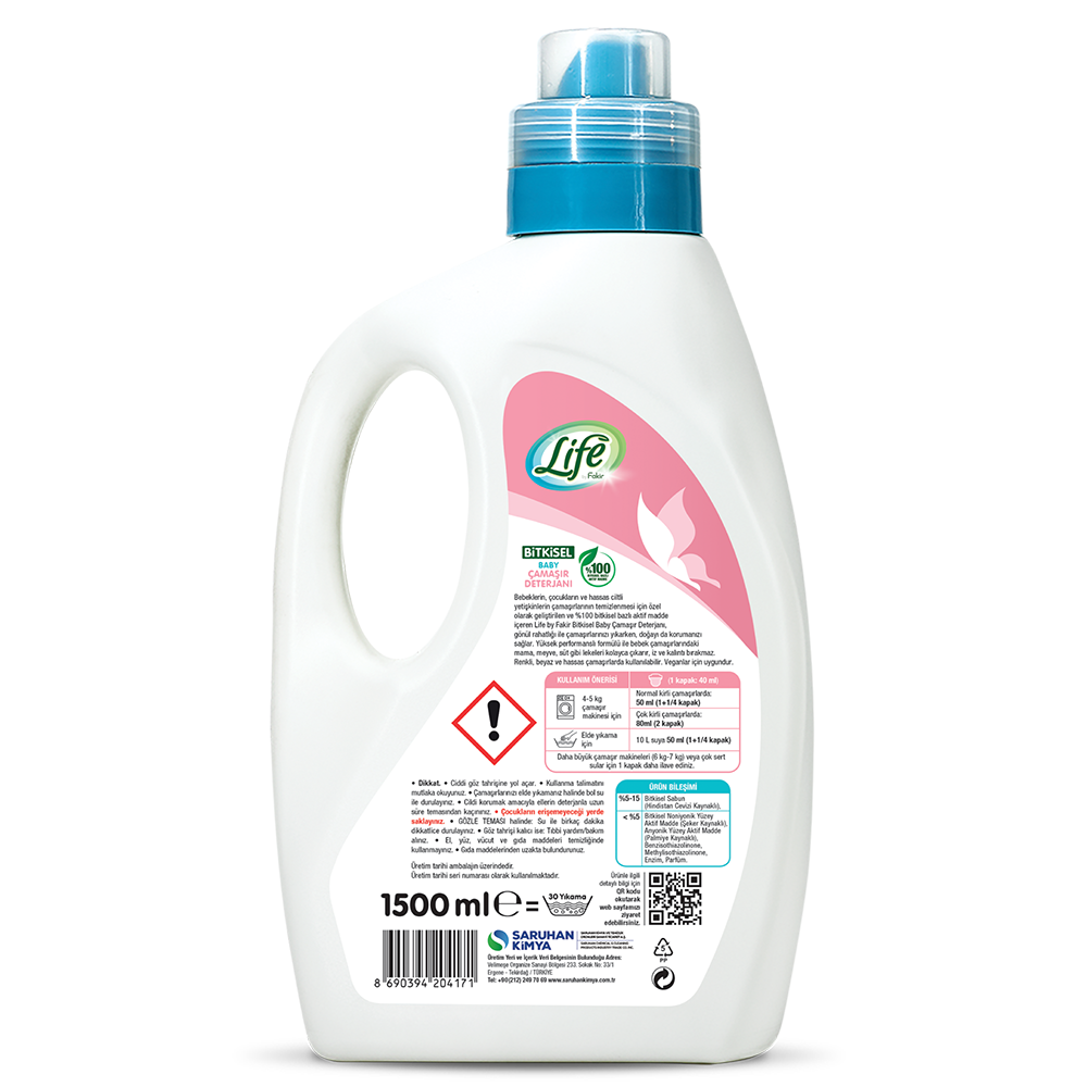 Life By Fakir Bitkisel Bebek Çamaşır Deterjanı, bebeklerin hassas ciltleri için özel olarak geliştirilmiş vegan, hipoalerjenik ve bitkisel içerikli güçlü bir temizlik ürünüdür. Bebeğin cildine temas eden kıyafetleri nazikçe temizlerken, gelişmiş enzim teknolojisi ile kir ve lekeleri etkili şekilde çözer.